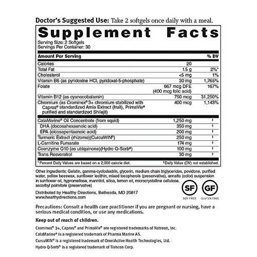 - TACKLES MULTIPLE HEART HEALTH CONCERNS IN 1 FORMULA. This formula brings in ALL the heavy hitters when it comes to heart health—heart healthy DHA from CalaMarine omega-3 oil, highly bioavailable CurcuWIN turmeric, resveratrol, PLUS a full 100mg of absorbable Hydro Q-Sorb CoQ10—critical for anyone over 60 or taking a statin medication. Plus, essential B vitamins and folic acid for heart and brain health, cellular energy production, and more. And l-carnitine, a perfect partner to CoQ10.