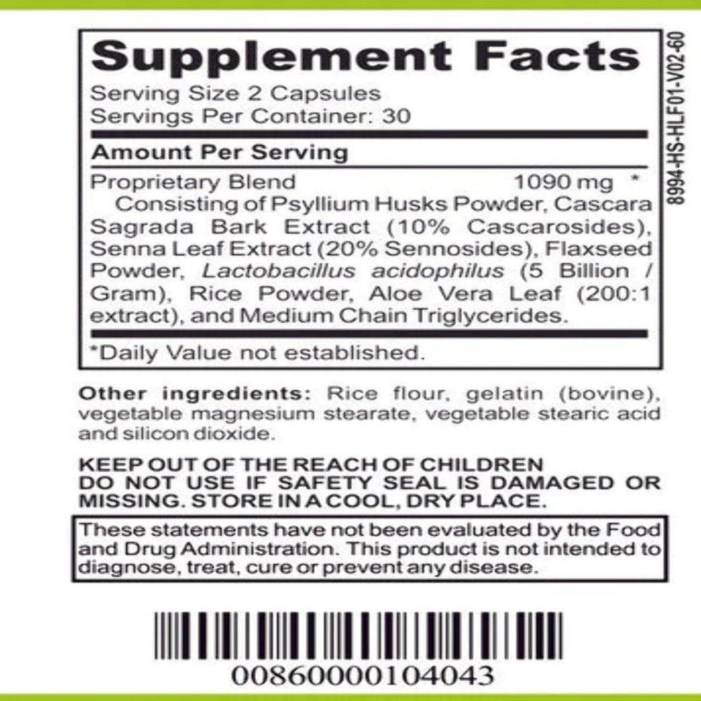 Ingredients: Proprietary blend of Psyllium Husks Powder, Cascara Sagrada Bark Extract (10% Cascarosides), Senna Leaf Extract (20% Sennosides), Flaxseed Powder, Lactobacillus acidophilus (5 Billion / Gram), Rice Powder, Aloe Vera Leaf (200:1 extract), and Medium Chain Triglycerides.