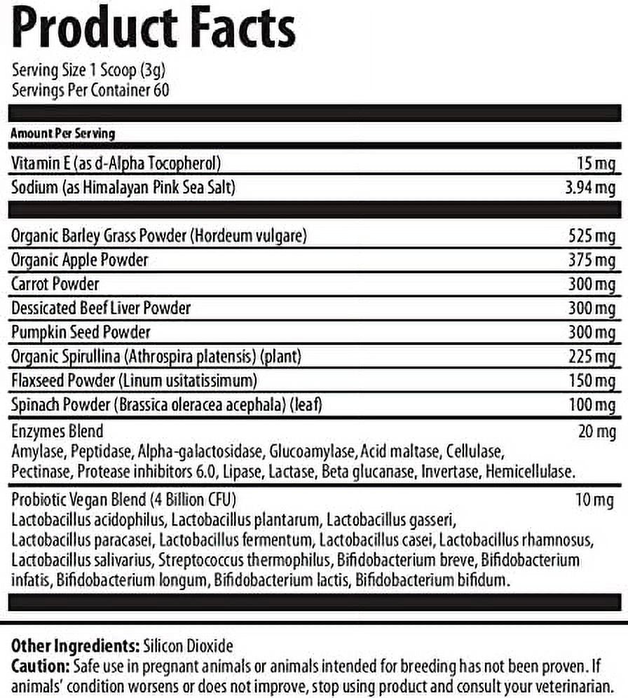 - SUPPORTS HEALTHY SKIN & COAT - Organic barley grass, spinach and spirulina work together to improve balance in the body by providing key vitamins amino acids, essential trace minerals, chlorophyll, and bioflavonoids.