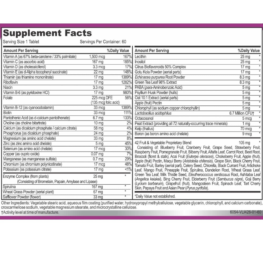 Vitamin A, Vitamin C, Vitamin D2, Vitamin E, Thiamin, Riboflavin, Niacin, Vitamin B6, Folic Acid, Vitamin B12, Biotin, Pantothenic Acid, Calcium, Ca Pantothenate, Iron, Iodine , Magnesium, Zinc, Selenium, Copper, Manganese, Chromium, Potassium, Boron, Choline, PABA, Hesperidin, Betaine HCl, Alpha GPC, L-Phenylalanine, L-Tyrosine, L-Taurine, L-Leucine, L-Isoleucine, L-Valine, L-Glutamine , CO-Q-10, CLA, AciBerry, Gingko Biloba, Alfalfa Leaf, GreenTea, Guarana, Rohodiola, Guta Kolo, Huperzine A/div>