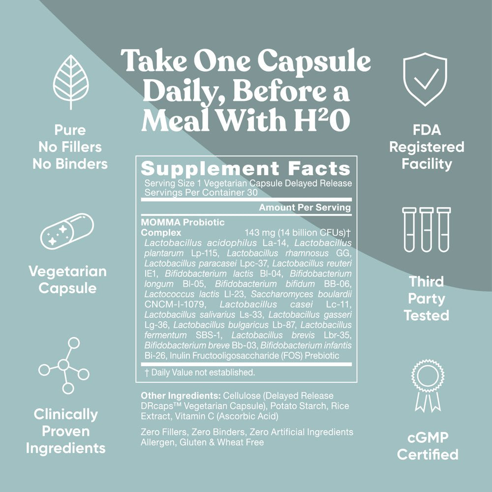 MOMMA PROBIOTICS contain an advanced blend of 14 billion CFUs uniquely designed to protect the balance of beneficial bacteria for your digestive system and vaginal microbiome. This probiotic blend helps support comfortable digestion, regularity, and natural immunity plus vaginal health support. PROBIOTICS FORMULATED FOR MOMS — to help support digestive comfort, regularity, vaginal health, immune support and healthy glucose levels. HELPS PROMOTE HEALTHY BLOOD GLUCOSE LEVELS — during pregnancy to support mom. ACID-RESISTANT CAPSULES – Powerful stomach acids can destroy most probiotics before they arrive in your lower gut. MOMMA PROBIOTICS capsules are made to withstand digestive acids, ensuring that 14 billion probiotic CFUs (colony forming units) arrive in your lower gut. DAILY SUPPORT– Just 1 capsule a day for support & protection, easy-to-swallow vegetarian capsules daily with a meal and water to deliver maximum daily support.