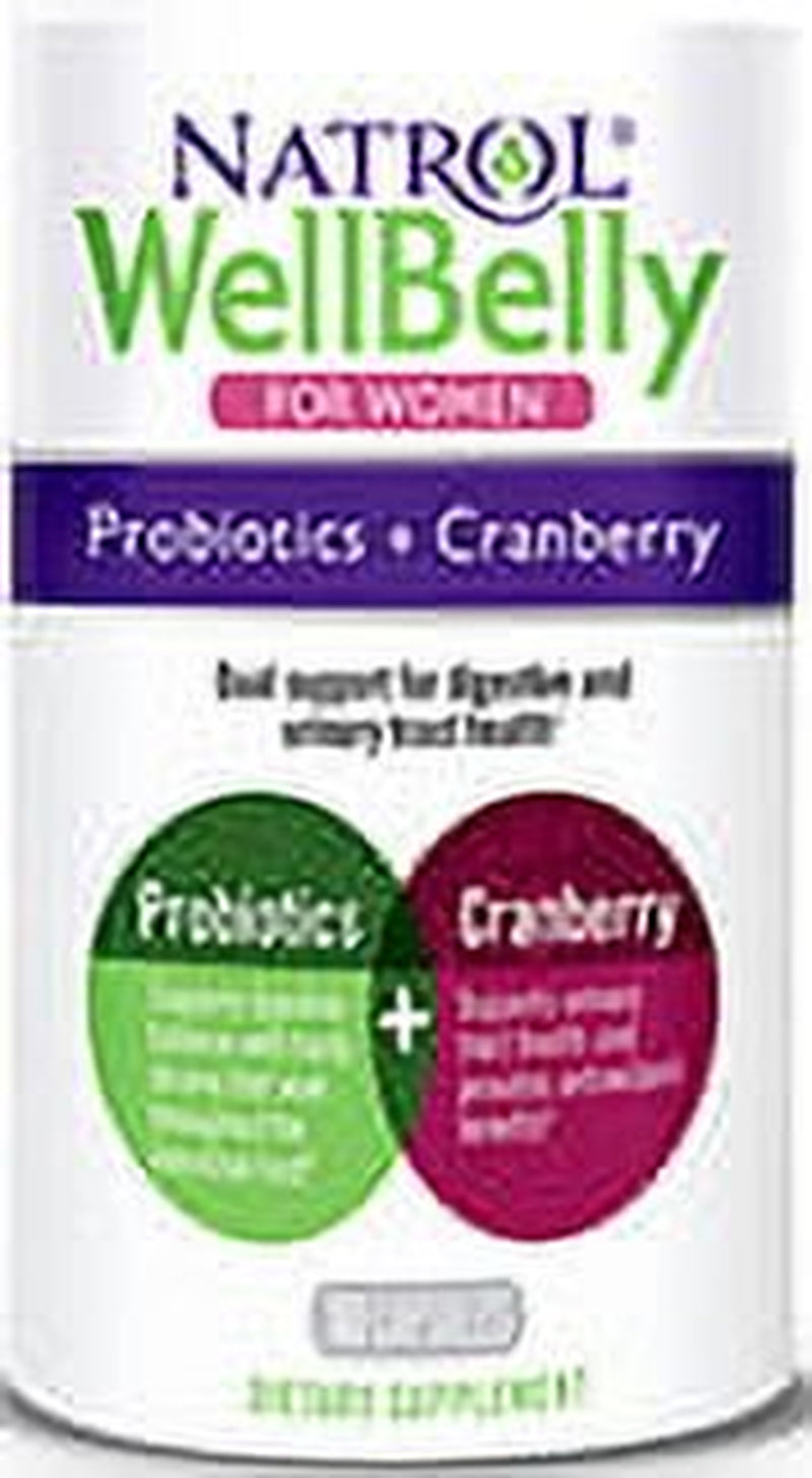 - Dietary Supplement. Dual support for digestive and urinary tract health. Probiotics: Supports digestive balance with hardy strains that work throughout the intestinal tract. Cranberry: Supports urinary tract health and provides antioxidant benefits. Probiotics: 5 hardy strains work throughout the intestinal tract. 2 billion live cultures guaranteed through expiration. Cranberry: Supports urinary tract health. Provides antioxidant benefits. Natrol WellBelly for Women supports both digestive and urinary tract health. Probiotics are beneficial bacteria that maintain digestive balance. Natrol WellBelly for Women uses 5 probiotic strains, with a high concentration of lactobacillus strains to support women's specific health needs. Cranberry, long associated with maintaining urinary health, is also known for its antioxidant benefits. Delayed release capsule helps ensure the probiotics arrive safely in the intestinal tract where they are most effective. www.natrol.com. No: Milk, egg, fish, crustacean shellfish, tree nuts, peanuts, wheat, soybeans, artificial colors or flavors, preservatives. (These statements have not been evaluated by the Food and Drug Administration. This product is not intended to diagnose, treat, cure, or prevent any disease.)