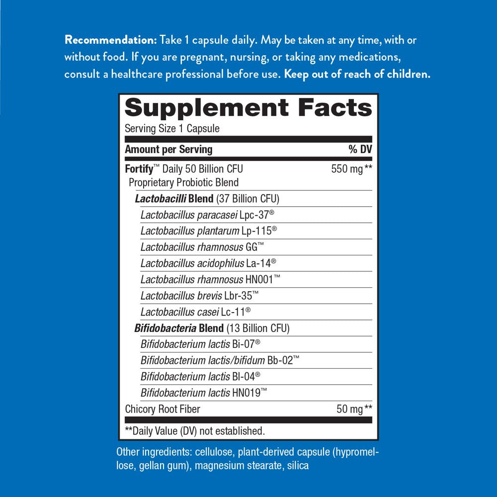 Fortify Daily 50 Billion CFU formula contains 11 probiotic strains designed to support gut diversity + prebiotics, a food source for good bacteria.*