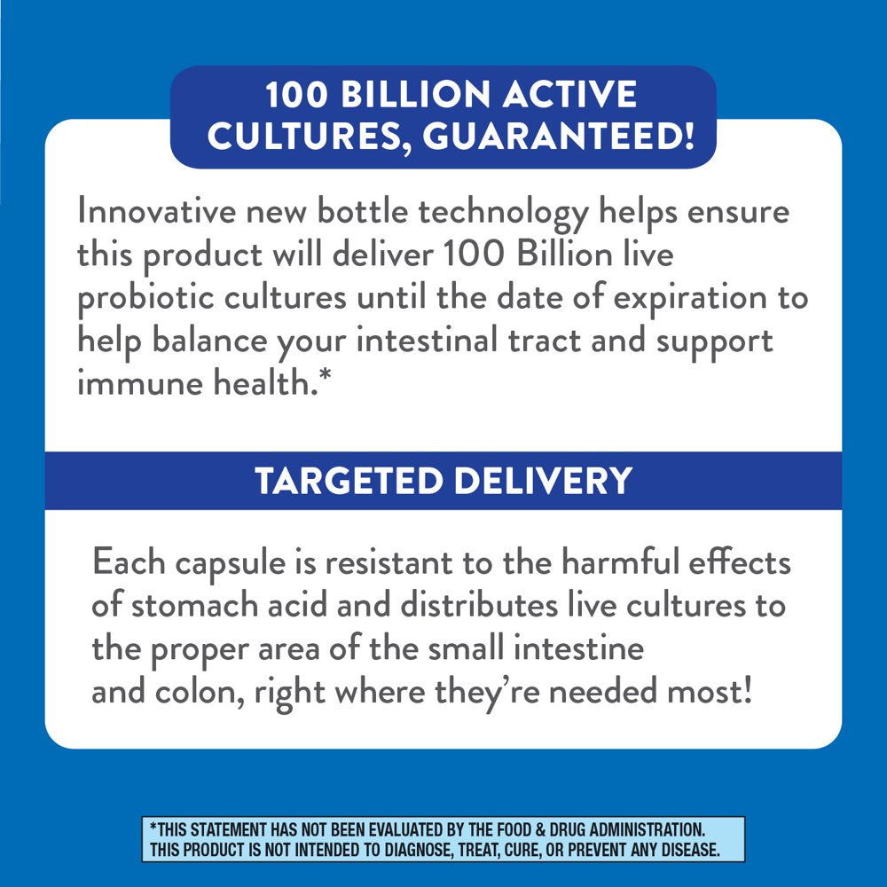 - Advanced care for digestive balance and immune health.* Daily probiotic with 100 billion live cultures per capsule.