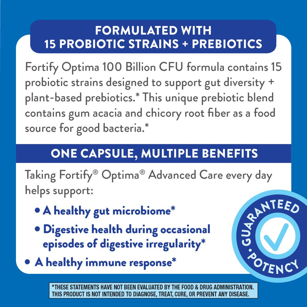 Nature’s Way Fortify Optima Daily Probiotic, 100 Billion CFU, 15 Strains, Digestive & Immune Support*, with Prebiotics, 30 Capsules. When it comes to your digestive health and balance, you may occasionally seek more advanced care.* Fortify Optima Advanced Care 100 Billion is one of our most potent formulas, with 15 probiotic strains and 100 billion live probiotic cultures per capsule, guaranteed.* This formula helps support digestive health during occasional episodes of digestive irregularity, a healthy immune response, and a healthy gut microbiome.*