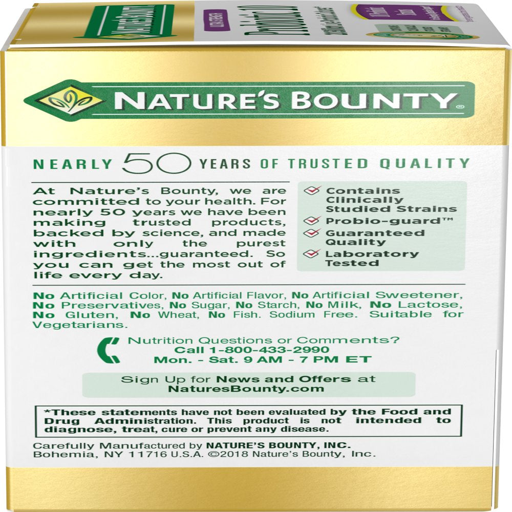 - FROM THE TRUSTED WELLNESS EXPERTS: Nature’s Bounty Probiotic supplements are a product of 50 years of dedication to quality, consistency and scientific research to make vitamins and nutritional supplements of unrivaled excellence.