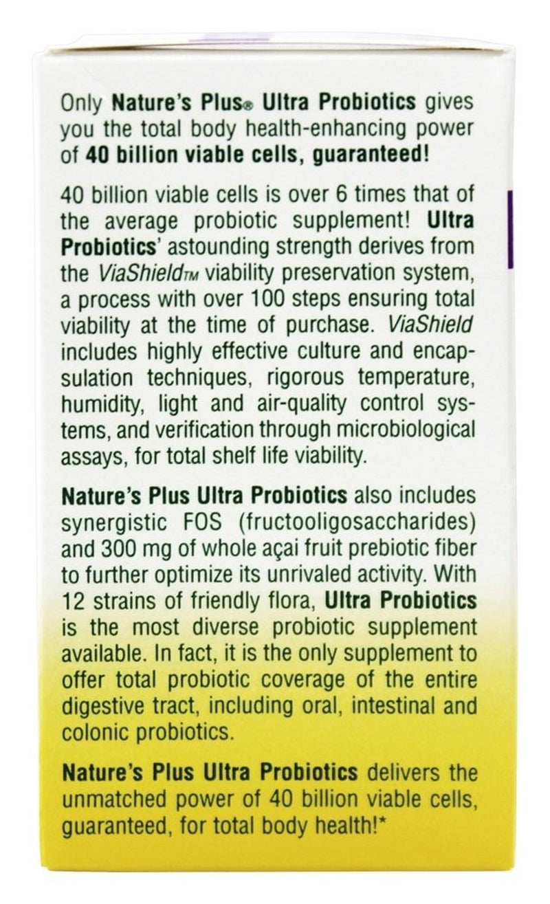 Nature's Plus Ultra Probiotics With ViaShield Maximum Strength - 30 Vegetarian Capsules Only Nature's Plus Ultra Probiotics with ViaShield Maximum gives you the total body health enhancing power of 40 billion viable cells, guaranteed! Nature's Plus Ultra Probiotics with ViaShield Maximum astounding strength derives from the ViaShield viability preservation system, ensuring total viability at the time of purchase. And with 12 strains of friendly flora, Nature's Plus Ultra Probiotics with