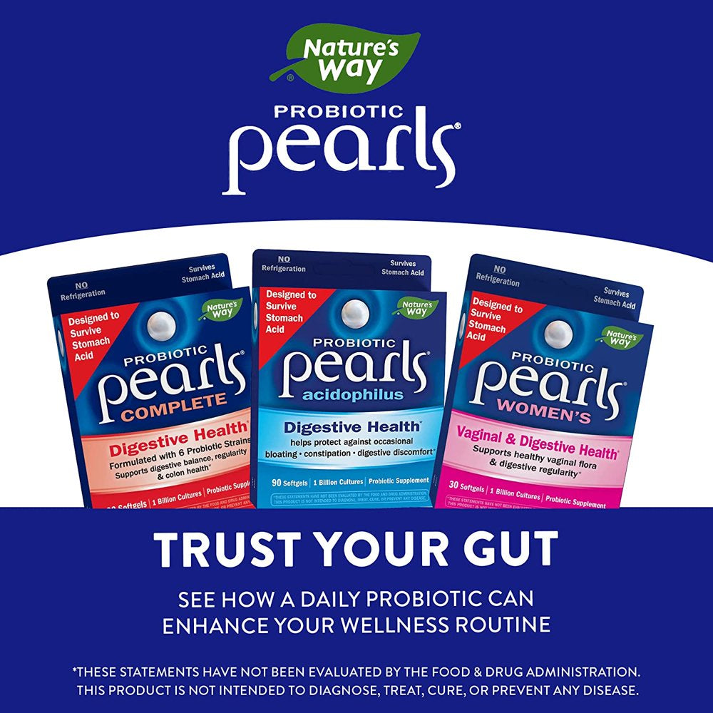 Natures Way Probiotic Pearls Complete is the smarter probiotic for digestive health.* Each serving contains 1 billion live, active cultures and Lactobacillus and Bifidobacteria strains to support your digestive, immune, and colon health.* A daily dose also helps protect against digestive discomfort, boating, and constipation.* The specially coated softgel is designed to survive stomach acid so the probiotics make it to your intestines, where theyre needed most.*This statement has not been evaluated by the Food and Drug Administration. This product is not intended to diagnose, treat, cure, or prevent any disease.