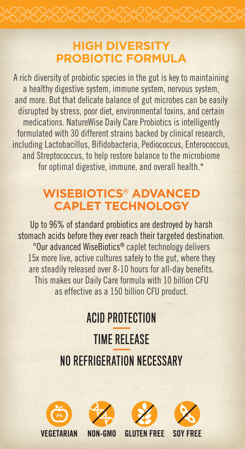 NatureWise Daily Care Probiotics is intelligently formulated to help replenish your gut with friendly bacteria and crowd out harmful microbes.* Our diverse formula includes 30 strains backed by clinical research to support your digestive, immune, and overall health.* Our unique Wisebiotics® time release technology protects our probiotics from harsh stomach acids and delivers them directly to the colon, where they are gradually distributed over 8-10 hours. This gives our probiotics a 15x higher survival rate than standard probiotics, making our 6 billion CFU product as effective as 90 billion CFU.*