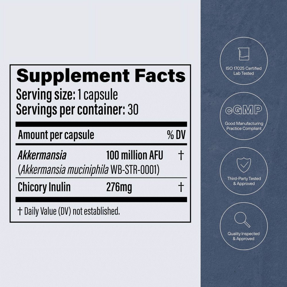 - ✔ POTENT INGREDIENTS - Aside from the proprietary Akkermansia muciniphila strain, Akkermansia also contains chicory inulin, a prebiotic fiber that passes through the lower gut and stimulates the growth of good bacteria. It acts as food for the Akkermansia probiotic. The combination of these ingredients helps create a diverse and healthy gut microbial ecosystem.