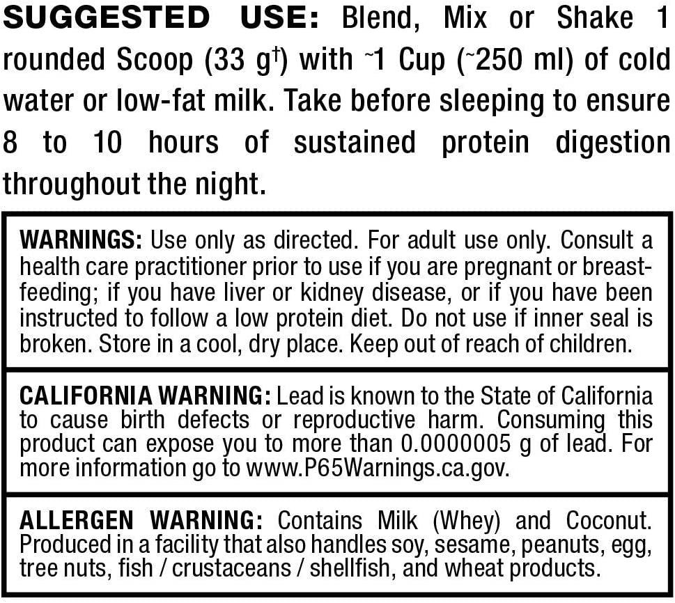 - SUGGESTED USE - Mix or shake 1 scoop with up to 6 oz of water or milk prior to sleeping or any time you want to increase your protein and reduce muscle breakdown. Ideally suited for any time you are unable to eat high-protein foods.