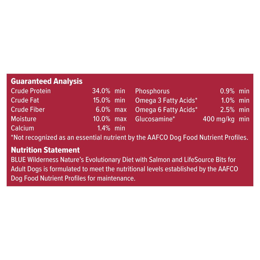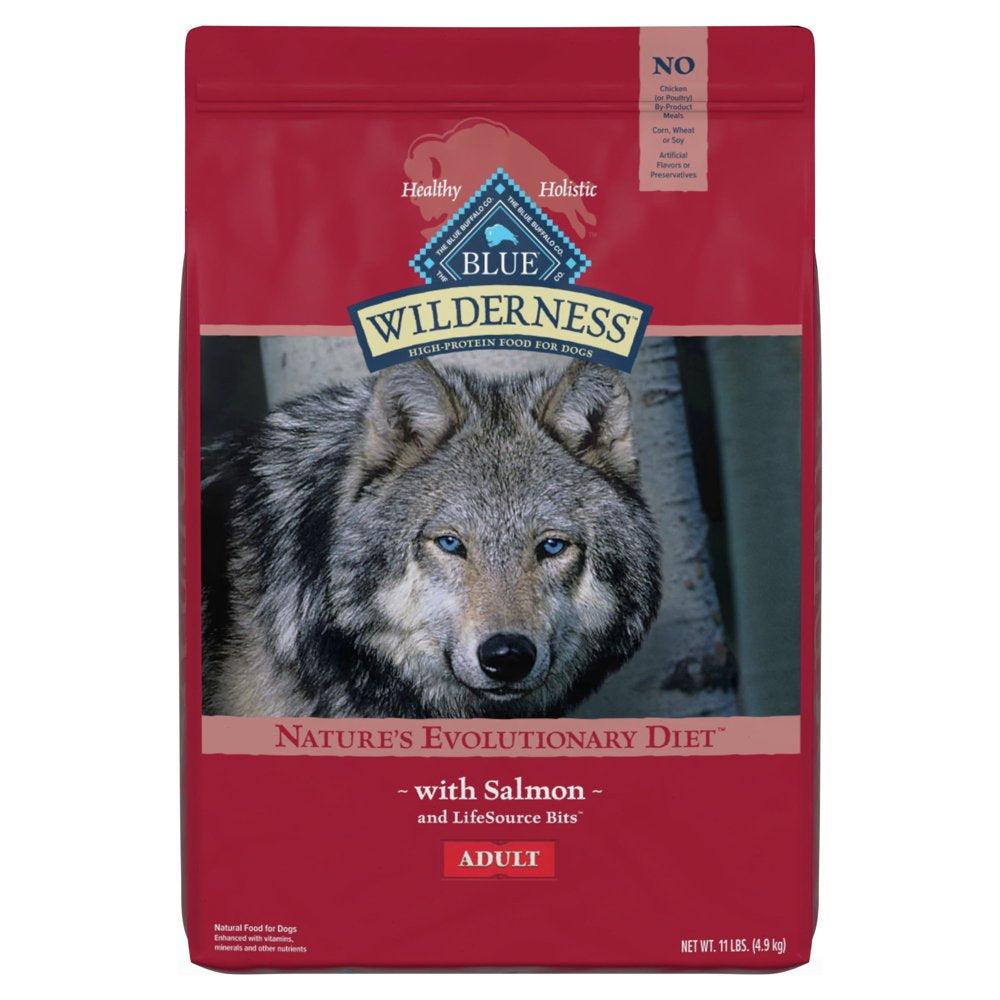 BLUE Wilderness natural dry dog food satisfies the spirit of the wolf in your canine with more of the meat dogs love. This high protein, grain free formula starts with delicious, protein-rich salmon, features antioxidant-rich LifeSource Bits and is enhanced with vitamins, minerals and other nutrients. Specially formulated for adult dogs, the high-quality protein plus complex carbohydrates from fruits and vegetables help support your dog’s energy needs.