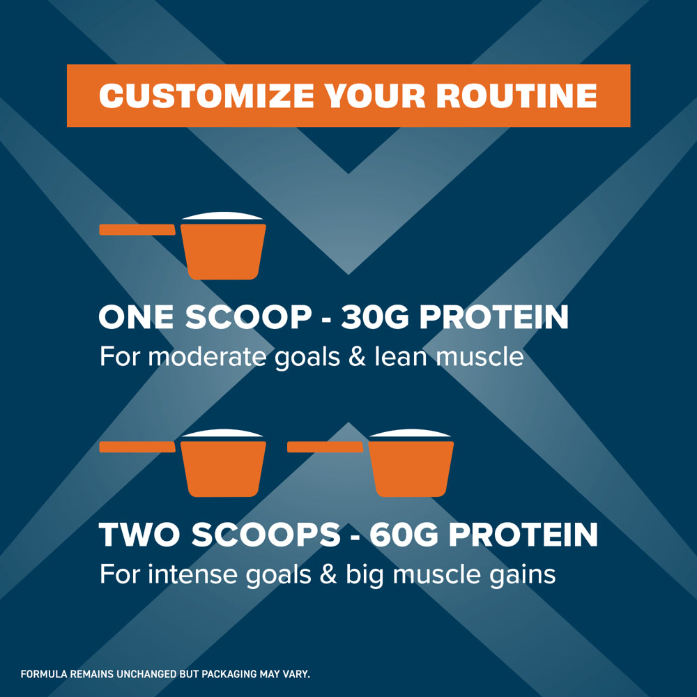 - ADJUSTABLE SERVINGS: For moderate performance goals and to build lean muscle, use one (1) scoop of Body Fortress 100% Whey for daily protein intake. For intense performance goals and big muscle gains, use two (2) scoops of Body Fortress 100% Whey for daily protein intake.