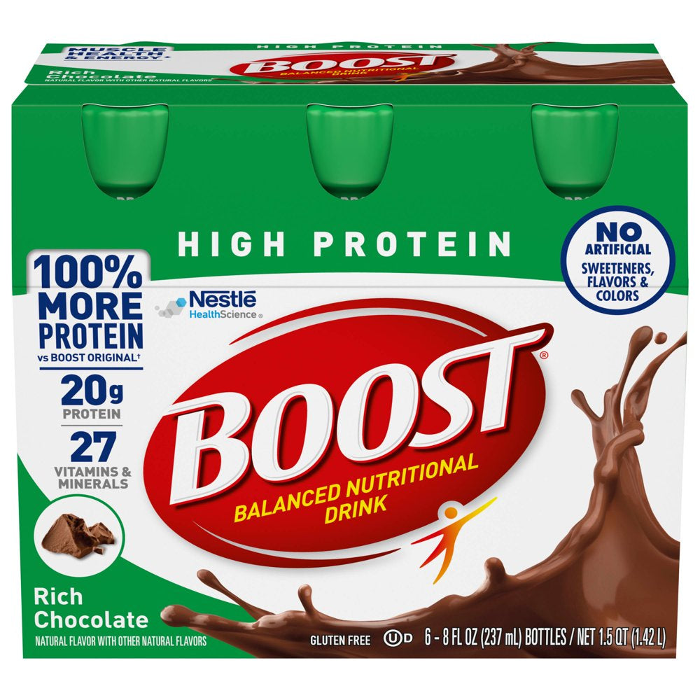 BOOST High Protein Rich Chocolate Flavored Nutritional Drink is a high protein nutritional shake that provides balanced nutrition as part of your daily diet. This rich chocolate high protein drinks provide 20 grams of protein for muscle health and 27 vitamins and minerals including vitamins C & D, zinc, iron and selenium, key nutrients for immune support. Not only does this high protein shake support muscle health, it is designed to provide nutritional energy with 250 nutrient-rich calories and B-vitamins to help convert food to energy. BOOST High Protein Rich Chocolate Nutritional Drinks have a delicious chocolate taste and provide 100% more protein than the BOOST Original drinks (20 g protein vs 10 g in BOOST Original). This pack of high protein chocolate drink includes six reclosable 8 fluid ounce bottles for easy storage and portability.