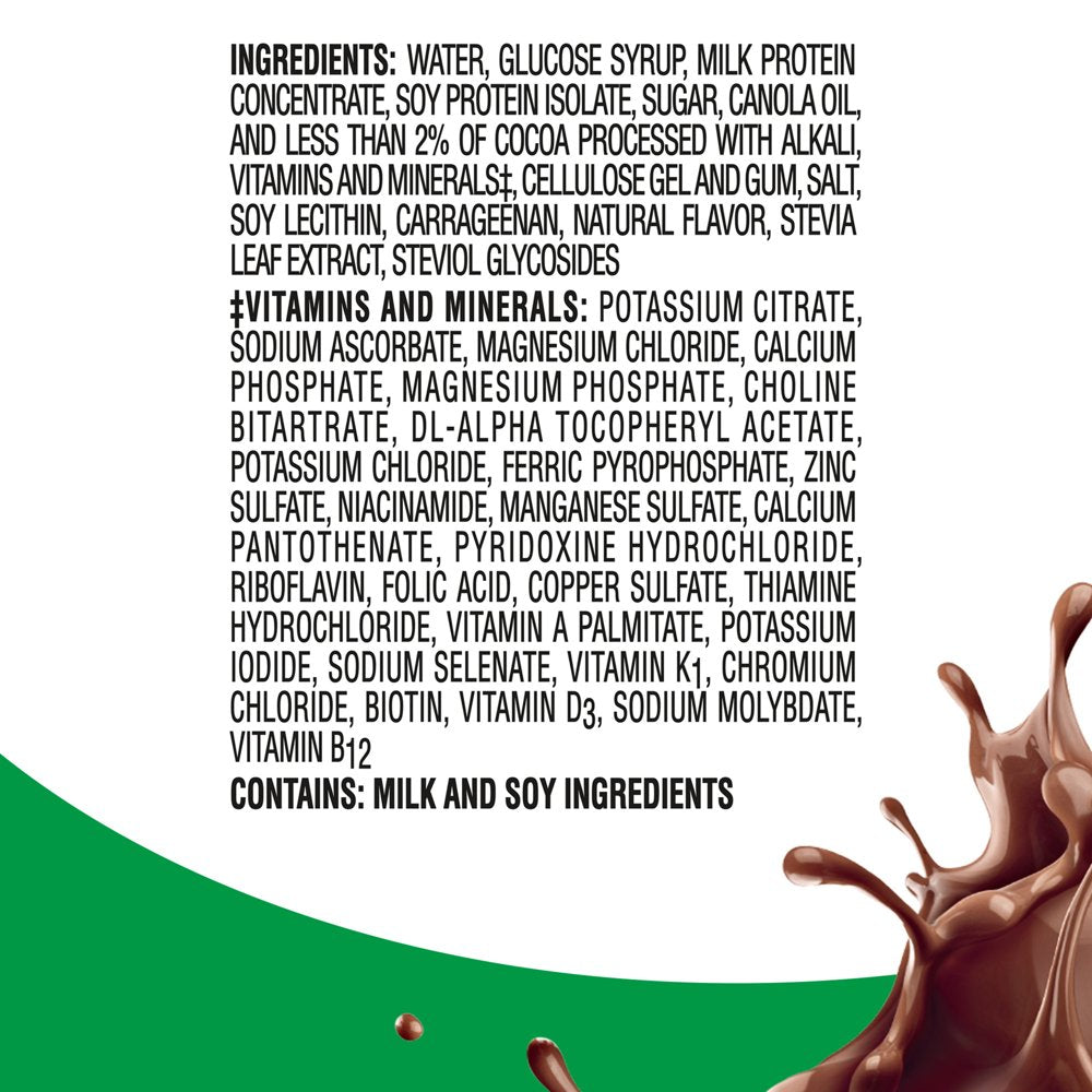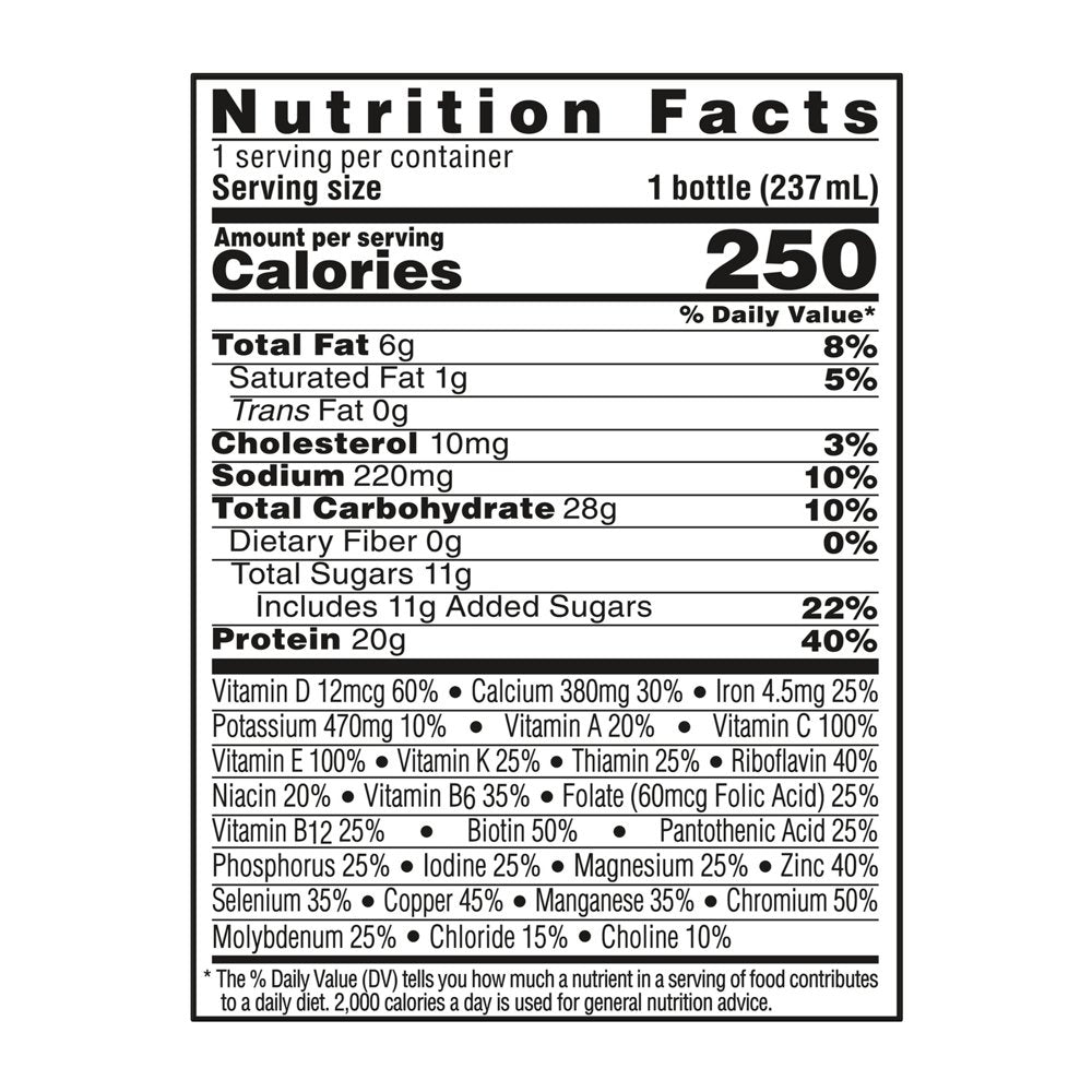 - Rich chocolate protein drink with 20 g of high quality protein for muscle health plus 27 vitamins and minerals per bottle