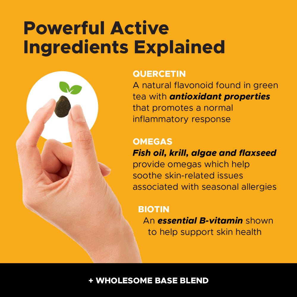 Powerful key ingredients like Probiotics, Flaxseed, Fish Oil, Kelp and Omegas help improve overall health, immune health and occasional allergies. The tasty chews help address skin issues from the inside out, leading to healthier skin and seasonal allergy support.