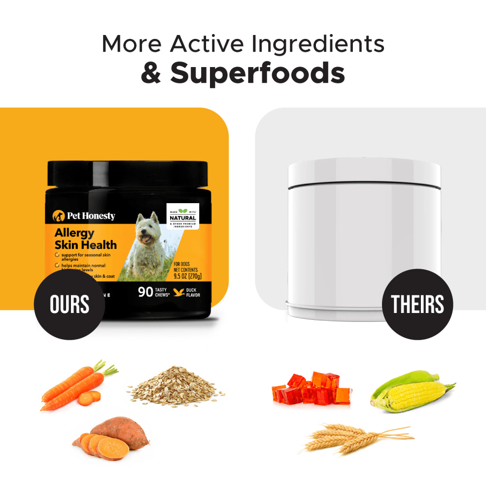 Pet Honesty's Allergy Skin Health Chews are formulated with natural ingredients to help soothe skin-related issues associated with seasonal allergies and support dogs who deal with seasonal and occasional allergies and associated skin issues.
