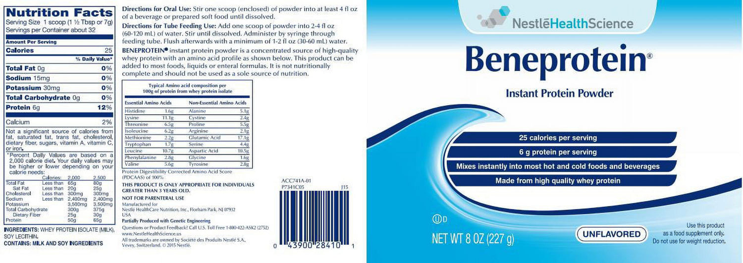 100% high-quality whey protein Each serving provides 6 g protein to help maintain muscle Contains no fillers, sweeteners or artificial flavorings Can be administered through a feeding tube as a flush Mixes instantly into a wide variety of foods and beverages Can be added to hot cocoa, tea, cottage cheese, applesauce, egg salad or yogurt Suitable for these diets: lactose intolerance, gluten-free, low-residue, kosher; Not for individuals with galactosemia Provides nutritional support for individuals who require high-protein diets, elevated protein requirements for renal (dialysis) or wound management or malnutrition