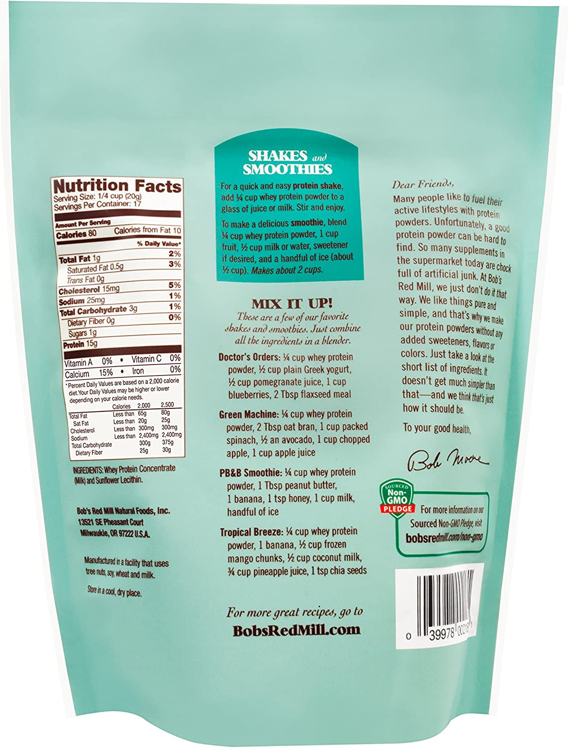 Bob's Red Mill Whey Protein Powder is a wonderful way to incorporate a boost of protein in your diet. It's a complete protein, which means it contains all of the essential amino acids. This is an unflavored, unsweeted protein powder without any artificial ingredients you might see in other brands' formulas. It dissolves instantly, so it's a lovely addition to shakes and smoothies. You can also mix it in to your yogurt, cold or hot cereal, granola or protein bars, or use it in baking muffins, breads, cakes, brownies, protein pancakes and more!