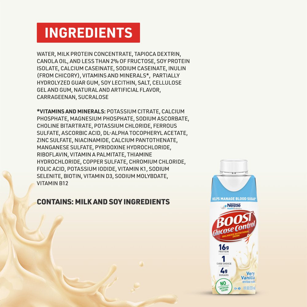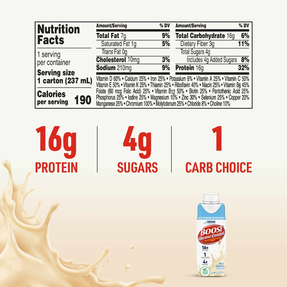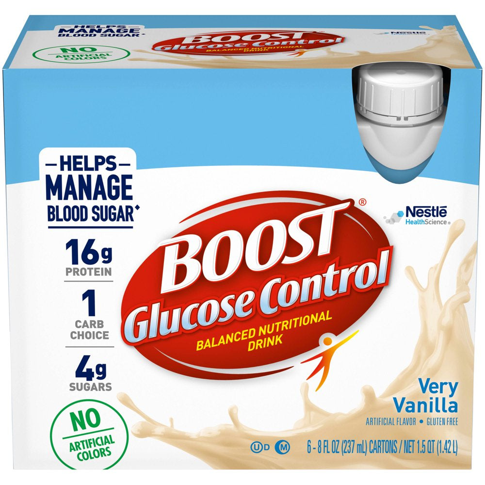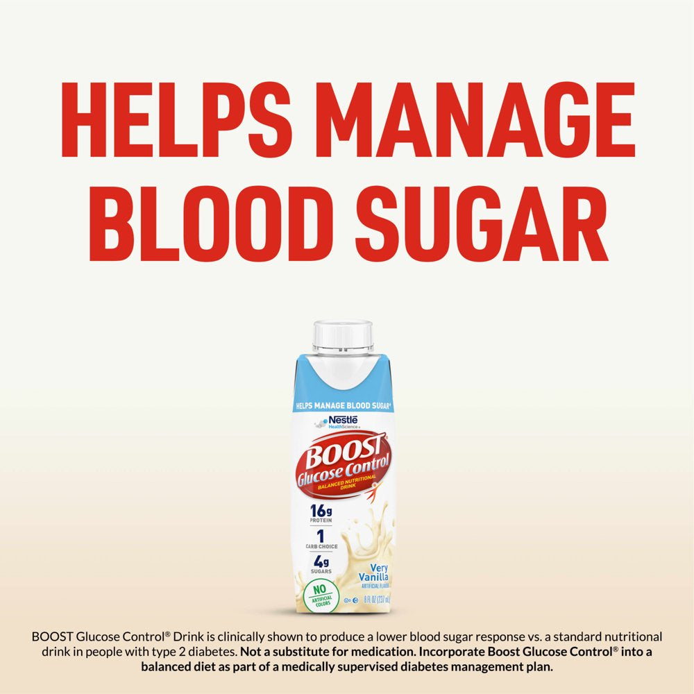 BOOST Glucose Control Very Vanilla Flavored Nutritional Drink is a balanced nutritional drink specially formulated to help people with diabetes manage blood sugar as part of a balanced diet.† This vanilla drink provides 25 vitamins and minerals and 16 grams of protein per serving that help to maintain muscle. With 16 grams of carbohydrates (1 Carb Choice) per bottle, this is a great choice if you're managing your carb intake. BOOST Glucose Control Very Vanilla Nutritional Drinks have a delicious taste. This pack of nutritional shakes includes six reclosable 8 fluid ounce cartons.†BOOST Glucose Control® Nutritional Drink is specially designed with a unique blend of protein, carbs and fat to help people with diabetes manage blood sugar levels as part of a balanced diet. NOT A SUBSTITUTE FOR MEDICATION.