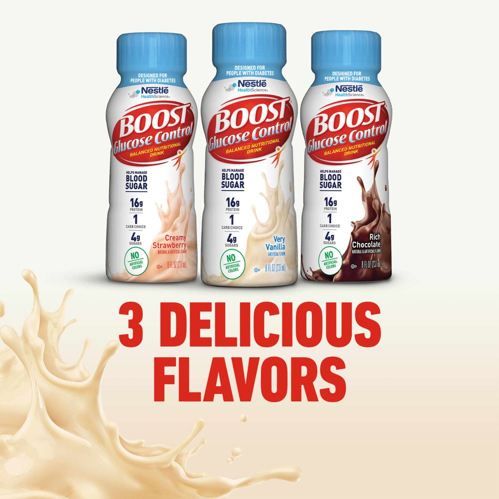 - Six 8 fl oz bottles of BOOST Glucose Control Very Vanilla Nutritional Drink