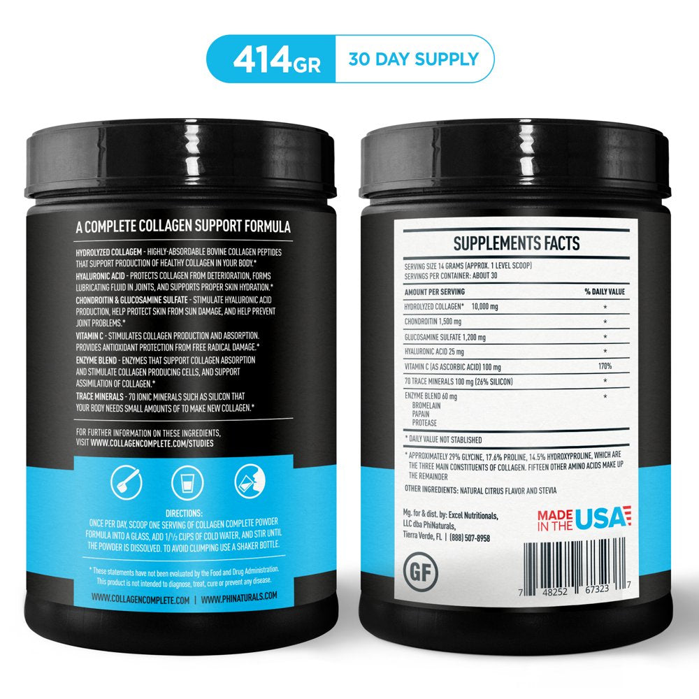 Collagen is the building block of healthy skin, joints, hair and nails. Collagen forms the elastic netting that supports youthful, vibrant-looking skin. As you age, your body's collagen deteriorates from use and exposure to free radicals. Proper collagen supplementation rebuilds the body's collagen. The skin regains its natural elasticity. Joints heal.Collagen is an anti-aging miracle. A Scientifically Proven Collagen Dose. Studies on the results of hydrolyzed collagen have used 10,000mg/day but most supplements don't provide anywhere near this daily dosage. This collagen powder is formulated for the best results, so each dose has 10,000mg of premium bovine collagen hydrolysate. This is one of the reason Collagen Complete is a powder. It's impractical to fit 10,000mg in a collagen pill or capsule, which is why no collagen pills on the market can provide the correct dose!Not Just One Type of Hydrolyzed Collagen.Many collagen supplements contain a limited profile of Collagen Types. Some contain only Collagen Type II, found mainly in joints. Other products contain only Collagen Types I & III, found mainly in the skin. Collagen Complete contains Collagen Types I, II, III and up to 15 more collagen types, making it a perfect collagen supplement for skin or joints! Rated one of the best collagen supplements available because it doesn't just provide collagen, but also stimulates your body to produce and protect collagen with these collagen-boosting ingredients: Hyaluronic acid, Chondroitin, Glucosamine Sulfate, Vitamin C, 70 trace minerals, and Proteolytic enzymes.
