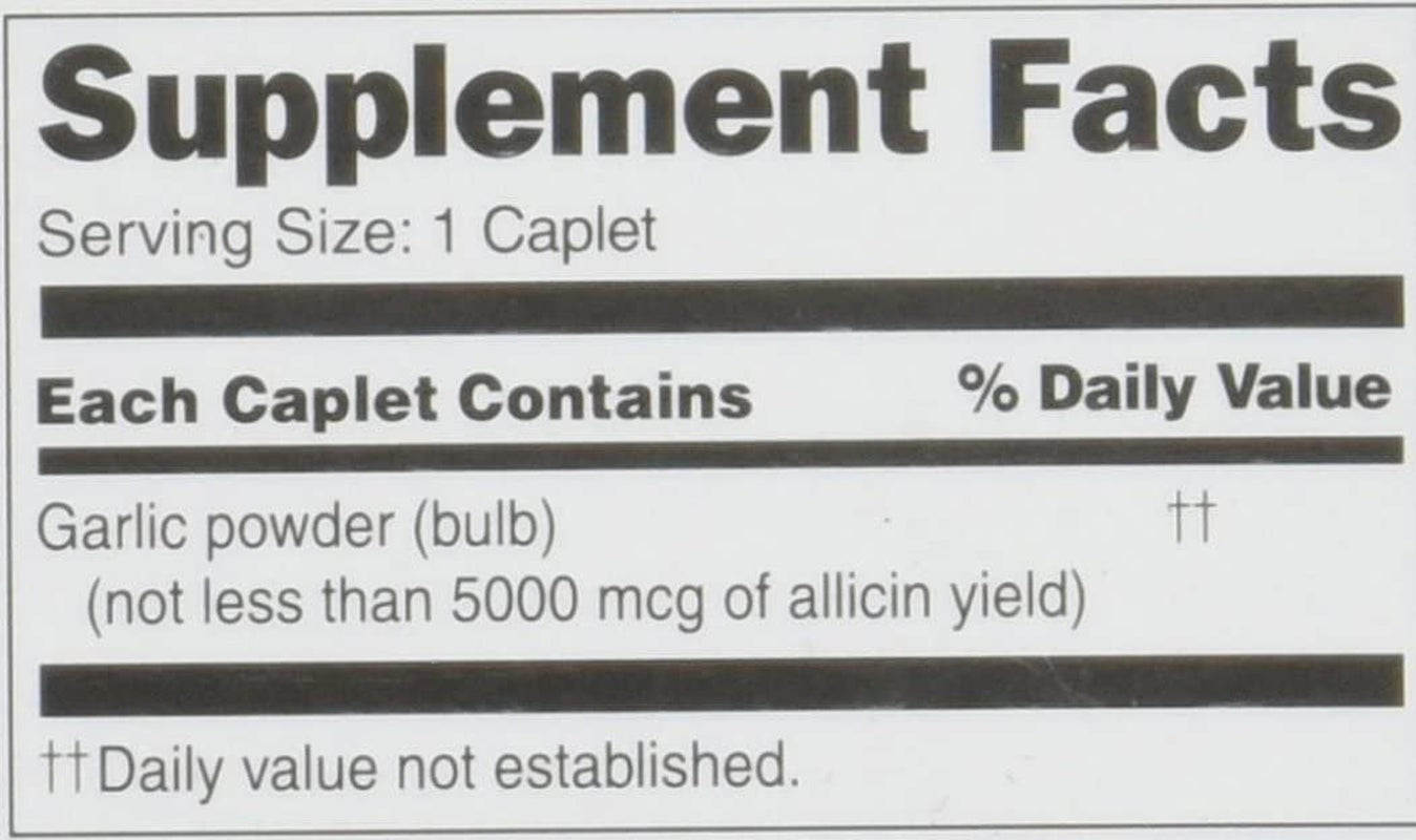 Garlic Powder (bulb), Silicified microcrystalline cellulose, croscarmellose sodium, methacrylic acid, hydroxypropylmethylcellulose, magnesium stearate, stearic acid, magnesium silicate, titanium dioxide, mineral oil, triacetin, polyethylene glycol, microcrystalline cellulose, glycerol monostearate, triethyl citrate, sodium lauryl sulfate Legal Disclaimer Disclaimer: While we work to ensure that product information is correct, on occasion manufacturers may alter their ingredient lists. Actual product packaging and materials may contain more and/or different information than that shown on our Web site. We recommend that you do not solely rely on the information presented and that you always read labels, warnings, and directions before using or consuming a product. For additional information about a product, please contact the manufacturer. Content on this site is for reference purposes and is not intended to substitute for advice given by a physician, pharmacist, or other licensed health-care professional. You should not use this information as self-diagnosis or for treating a health problem or disease. Contact your health-care provider immediately if you suspect that you have a medical problem. Information and statements regarding dietary supplements have not been evaluated by the Food and Drug Administration. Statements regarding dietary supplements have not been evaluated by the FDA and are not intended to diagnose, treat, cure, or prevent any disease or health condition.