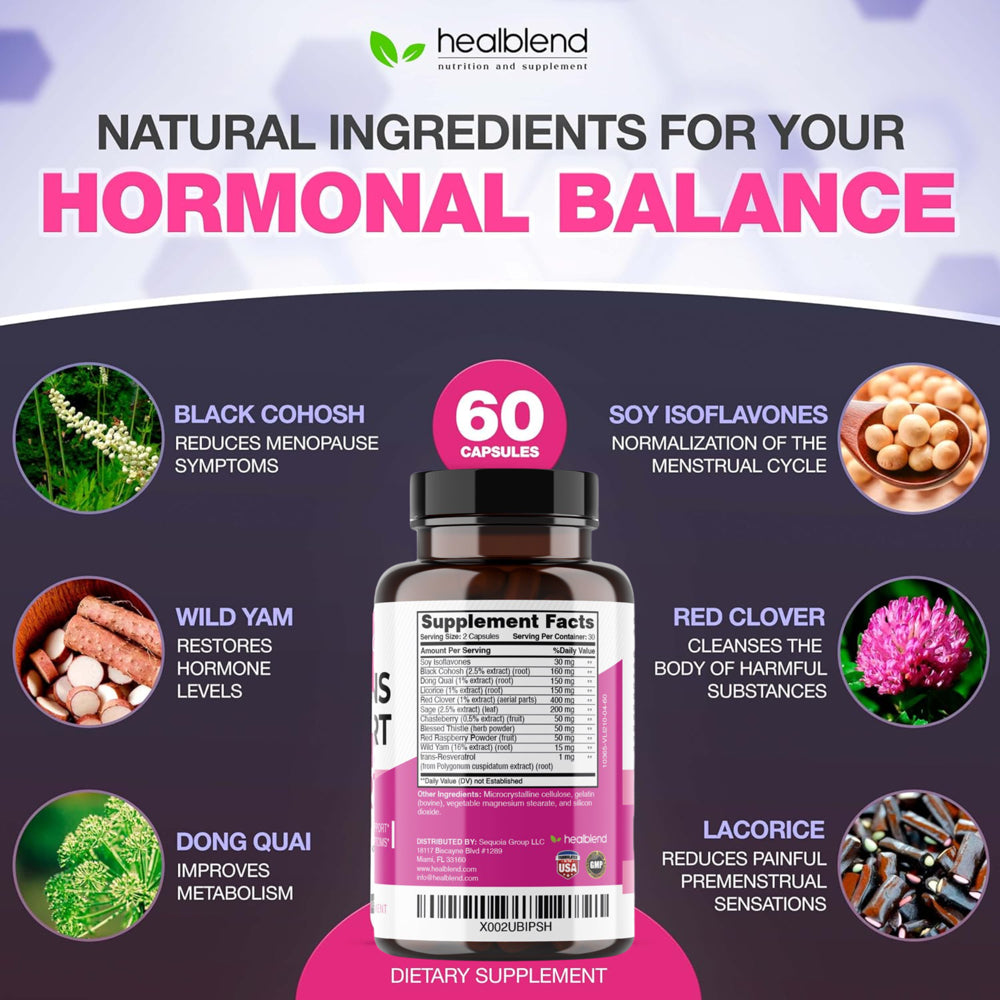 Healblend Women’s Support Complex Advanced Formula - Female Support Supplement for Hot Flashes, Night Sweats, Boosting Mood, Symptoms of Perimenopause and Menopause - Hormone Regulation Naturally - 60 Capsules BEST FEMALE SUPPORT FORMULA SUPPLEMENT If you miss feeling happy and just plain normal as a woman, then these carefully formulated synergetic blend of ingredients supplement will not just help you relieve the uncomfortable symptoms of perimenopause and menopause such sudden uncontrollable hot flashes, night sweats, fatigue, skin problems, disturbances in mood and many others but also help support hormonal balance in general so your spirit, mind and body are able to sync and begin again to enjoy the simple pleasures of life, health, beauty and love