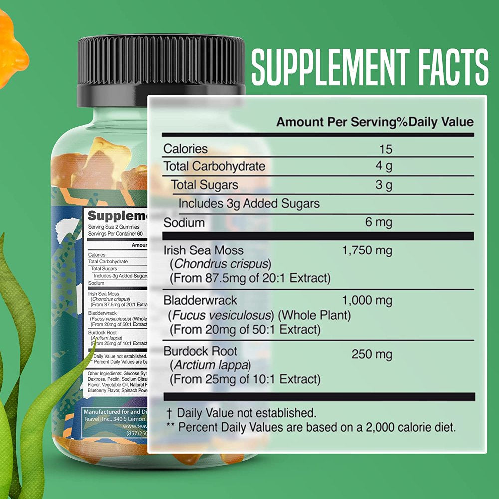- AT TEAVELI, WE’RE PASSIONATE about EMPOWERING YOU to LIVE YOUR FULLEST LIFE. Each bottle of our Irish Sea Moss Bladderwrack Burdock Root Vegan Vitamins Gummies for adults complies with our STRICT SAFETY STANDARDS, undergoing rigorous 3rd-party LAB TESTS. If for any reason you aren’t satisfied with your seaweed vitamins, we’re always here to help make it right.