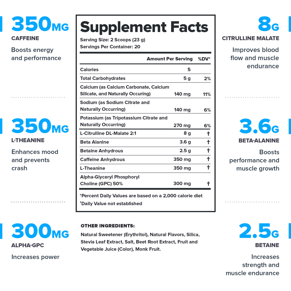 Pulse contains natural ingredients proven to increase energy, improve mood, sharpen focus, enhance strength, power, and endurance, and reduce fatigue, including . . . Pulse contains no harsh or dangerous stimulants, either, so you get to enjoy a smooth pre workout boost without the jitters, upset stomachs, or post-workout crashes. Every ingredient is backed by peer-reviewed scientific research and is included at clinically effective levels. Pulse is also naturally sweetened and flavored and contains no artificial food dyes, fillers, or other unnecessary junk.