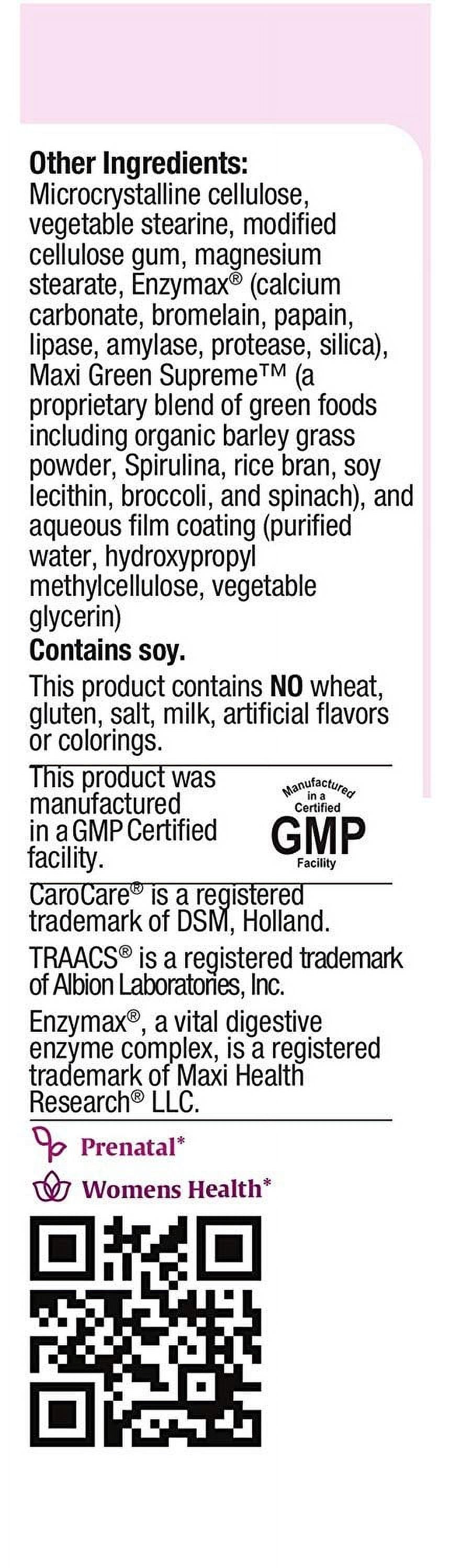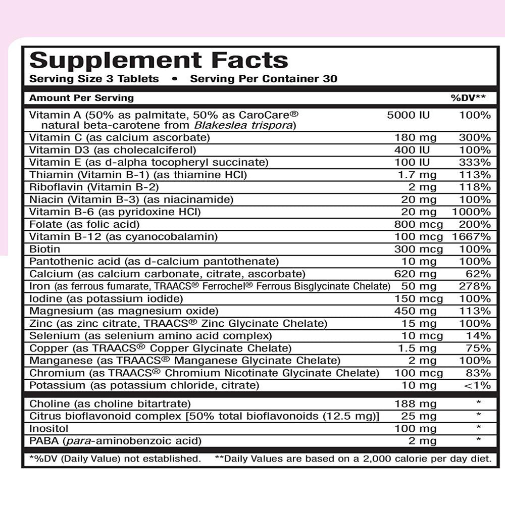 Nutrition Facts: Vitamin A (50% as palmitate 50% as beta-carotene) 5000 IU 100%'Vitamin C (as Ester C calcium ascorbate) 180 mg 300%'Vitamin D (as cholecalecalciferol) 400 IU 100%'Vitamin E (as d-alpha tocopheryl succinate) 100 IU 333%'Thiamin (Vitamin B-1 (as thiamine HCI) 1.7 mg 113%'Riboflavin (Vitamin B-2) 2 mg 117%'Niacin (Vitamin B-3) (as niacinamide) 20 mg 100%'Vitamin B-6 (as pyridoxine HCI) 20 mg 1000%'Folic Acid 800 mcg 200%'Vitamin B-12 (as cyanocobalamin) 100 mcg 1667%'Biotin 300 mcg 100%'Pantothenic acid (as d-calcium pantothenate) 10 mg 100%'Calcium (as calcium carbonate, citrate, ascorbate) 620 mg 62%'Iron (as ferrous fumarate, amino acid chelate) 50 mg 278%'Iodine (as potassium iodide) 150 mcg 100%'Magnesium (as magnesium oxide) 450 mg 113%'Zinc (as zinc citrate, amino acid chelate) 15 mg 100%'Selenium (as selenium amino acid chelate) 10 mcg 14%'Copper (as copper amino acid chelate) 1.5 mg 75%'Manganese (as manganese amino acid chelate) 2 mg 100%'Chromium (as ChromeMate chromium polynicotinate) 100 mcg 83%'Potassium (as potassium chloride, citrate) 10 mg **'Choline (as choline bitartrate) 188 mg *'Citrus Bioflavoniod complex [including 3% hesperidin (750 mcg)] 25 mg *'Inositol 100 mg *'PABA (para-aminobenzoic acid) 2 mg *