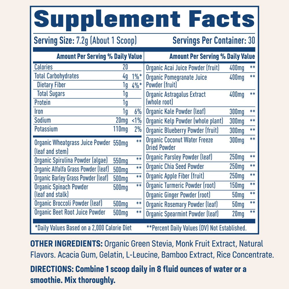 - Drink Your Daily Veggies: Your all-in-one organic superfood greens powder with 21 real-food ingredients—loaded with vitamins, minerals, and antioxidants. A standout juice cleanse and smoothie mix to give your body the support it needs for optimum nourishment.