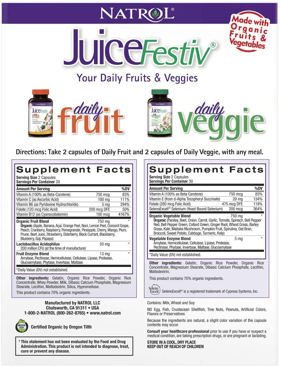 Natrol, Juicefestiv Daily Fruits & Veggies Capsules, 120 Count (Two 60 Count Bottles)