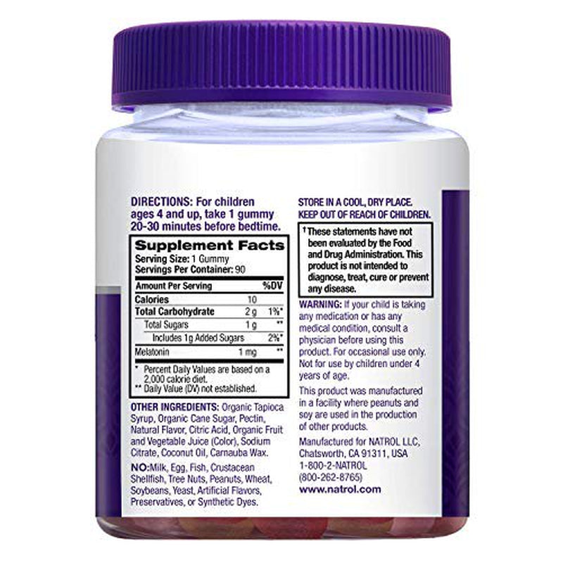Natrol Kids Melatonin Sleep Aid Gummy, Fall Asleep Faster, 100% Drug-Free and Gelatin Free, Non-Gmo, for Ages 4 & Up, 1Mg, 90 Berry Flavored Gummies
