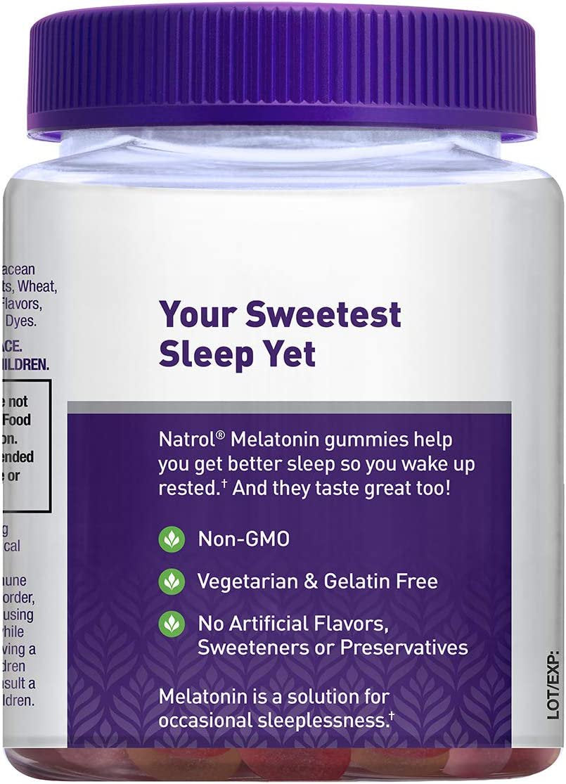 Melatonin is a key component of your body's "sleep-wake" cycle, signaling your body that it is time to sleep. Aging, stress levels, diet, exercise, and external factors such as blue-light emitting smart phones, tablets and computers can disrupt and minimize our body's ability to produce melatonin. Natrol® Melatonin Gummies help you fall asleep faster, stay asleep longer, and wake up rested.† They are non-GMO, vegetarian and are free of artificial flavors, sweeteners, and preservatives and synthetic dyes. Because they are pectin-based, they are less likely to stick to your teeth than standard gelatin gummies. †These statements have not been evaluated by the Food and Drug Administration. This product is not intended to diagnose, treat, cure or prevent any diseases. Melatonin is naturally produced by our bodies to help guide sleep cycles, but its balance can be easily disrupted. Natrol® Melatonin helps you fall asleep faster, stay asleep longer, and wake up rested.† Natrol® Gummies are made with organic sweeteners, non-GMO and are free of artificial sweeteners, flavors, preservatives, or synthetic dyes. Natrol® Gummies are pectin based and contain no gelatin, so they are less likely to stick to teeth than standard gelatin gummies. Natrol® Melatonin Gummies are available in a great-tasting strawberry flavor. Natrol® Melatonin Gummies are 100% drug-free and non-habit forming. Natrol® is one of the leading U.S. dietary supplement brands^ helping people around the world to support immune health, beauty, sleep, mood and brain health.†^xAOC February 26, 2022