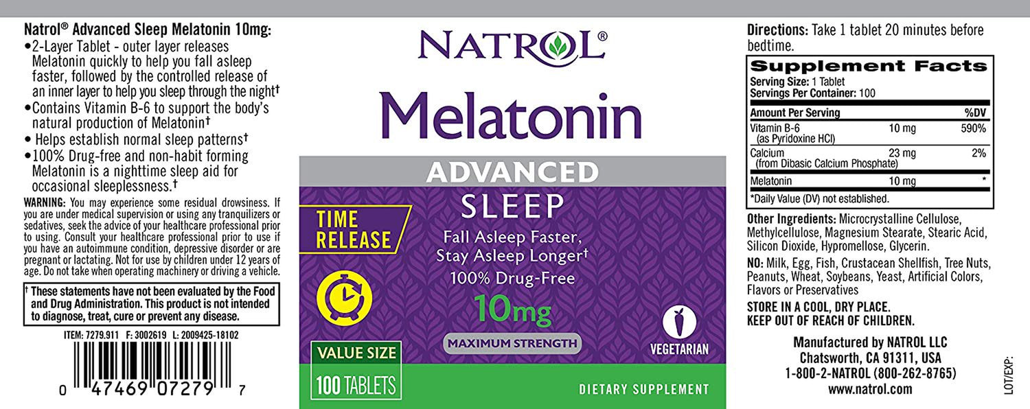 Natrol Melatonin Advanced Sleep Tablets with Vitamin B6, Helps You Fall Asleep Faster, Stay Asleep Longer, 2-Layer Controlled Release, 100% Drug-Free, Maximum Strength, 10Mg, 100 Count is backordered and will ship as soon as it is back in stock.
