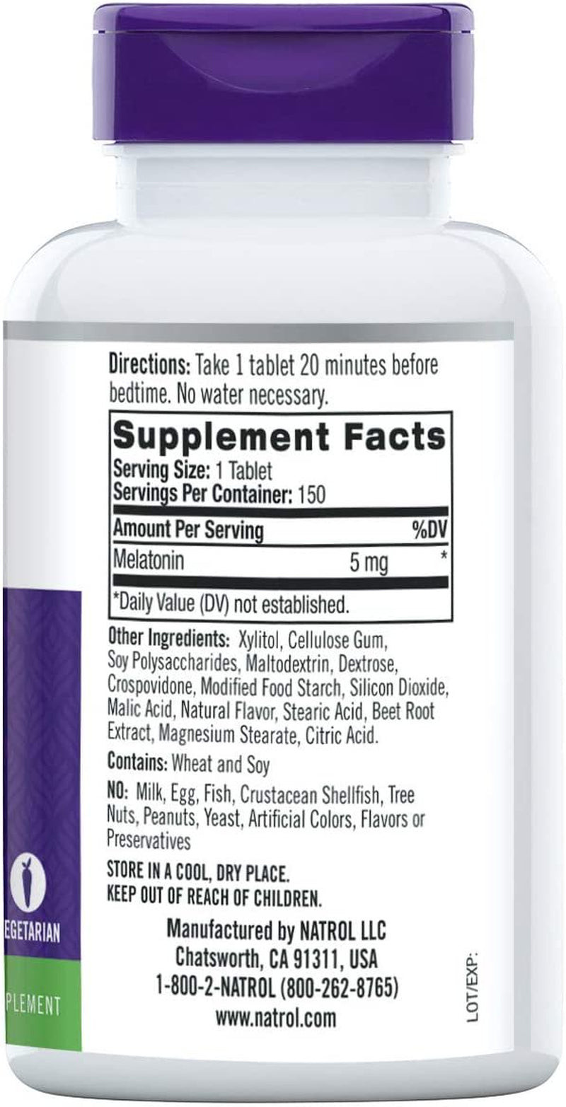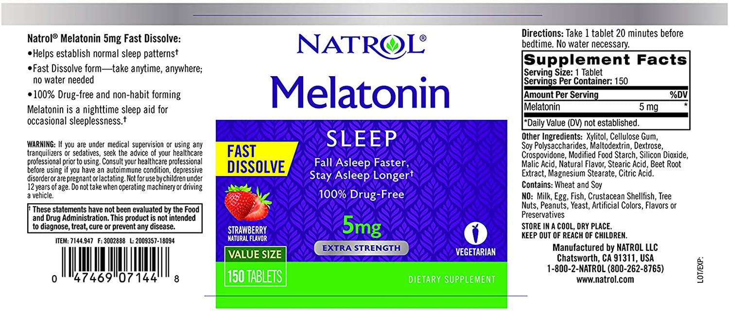 Sleep Fall Asleep Fast, Stay Asleep Longer 100% Drug-Free Extra Strength Vegetarian Value Size Dietary Supplement Natrol Melatonin 5 mg Fast Dissolve: Helps establish normal sleep patterns Fast Dissolve form - take anytime, anywhere; no water needed 100% Drug-Free and non-habit forming Melatonin is a nighttime sleep aid for occasional sleeplessness.