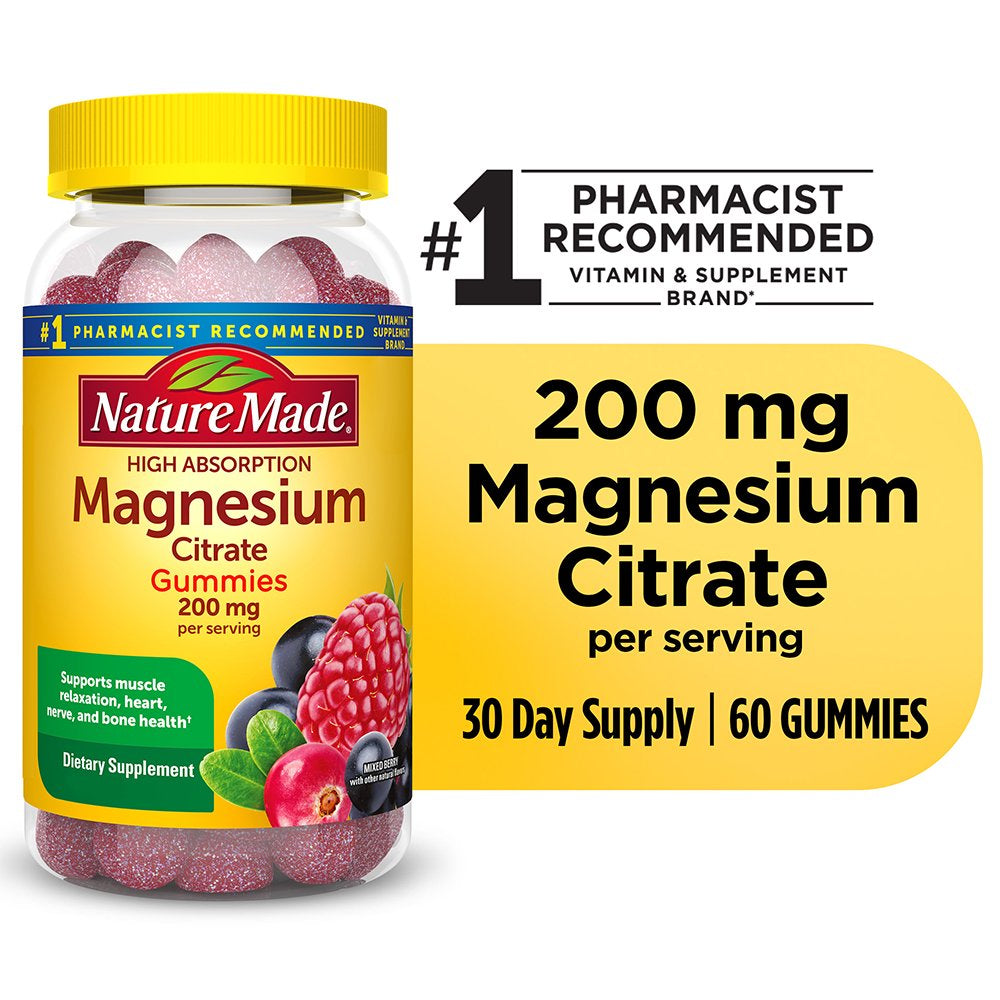 - Nerve, bone and heart support supplement: contains one 60 count bottle of Nature Made High Absorption Magnesium Citrate 200 mg per serving Gummies for a 30-day supply