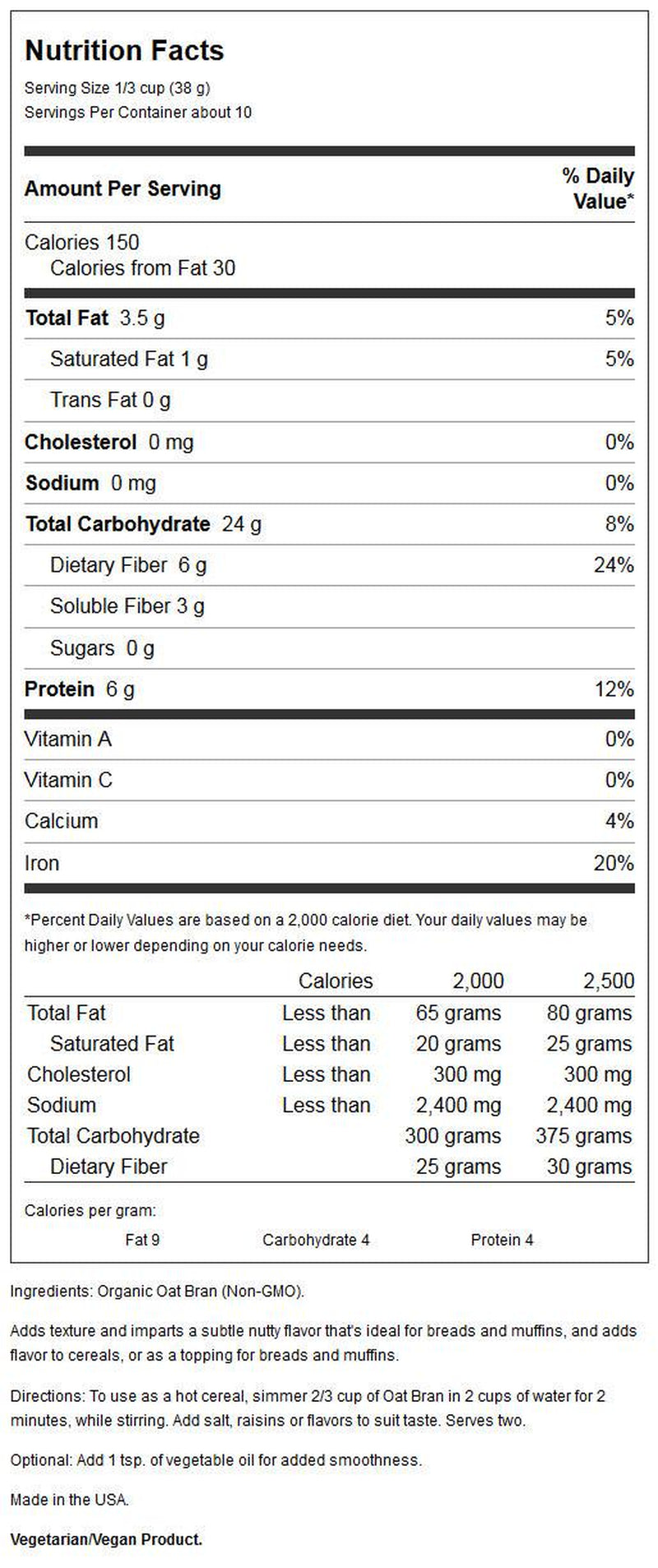 - 2 GRAMS OF SOLUBLE FIBER: A serving of our Organic Oat Bran supplies 2 grams of the 3 grams soluble fiber from oat bran necessary per day to have this effect.