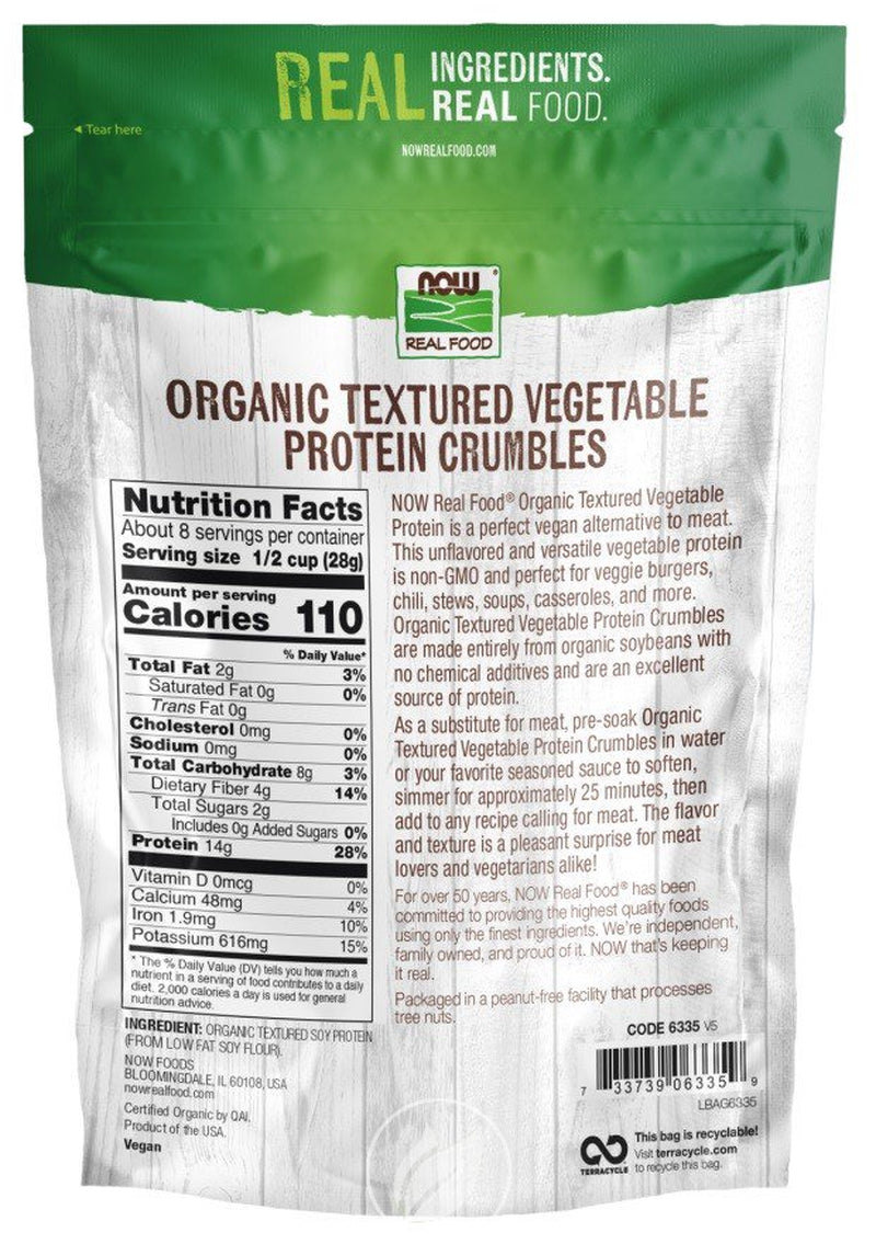 NOW Real Food Organic Textured Soy Protein (T.S.P. is the healthy vegetarian alternative to meat. This unflavored and versatile vegetable protein is non-GMO and perfect for vegetarian burgers, chili, stews, soups, casseroles, and more. NOW Real Food Organic T.S.P. Granules are made entirely from organic soybeans with no chemical additives and are an excellent source of protein.