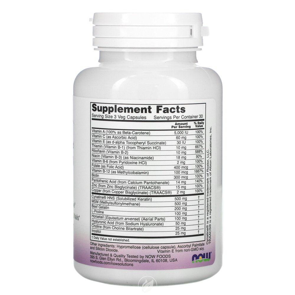 NOW Solutions Clinically Advanced Hair, Skin & Nails is formulated to nurture hair, skin, and nails from the inside. This product features Cynatine HNS, a revolutionary patented and bioavailable form of solubilized keratin that can help you maintain full, lustrous hair and nails that are strong and flexible.* Cynatine HNS can also help the skin to retain its youthful moisture and elasticity, as well as battle signs of aging associated with free radicals.* This product also has other critical nutrients necessary for the support and maintenance of the skin's healthy and youthful appearance.* Cynatine is a registered trademark of Roxlor, LLC.; U.S. Patent 7,838,042 and patents pending, and the trademark TRAACS are used under license from Albion Laboratories, Inc. Natural color variation may occur in this product.