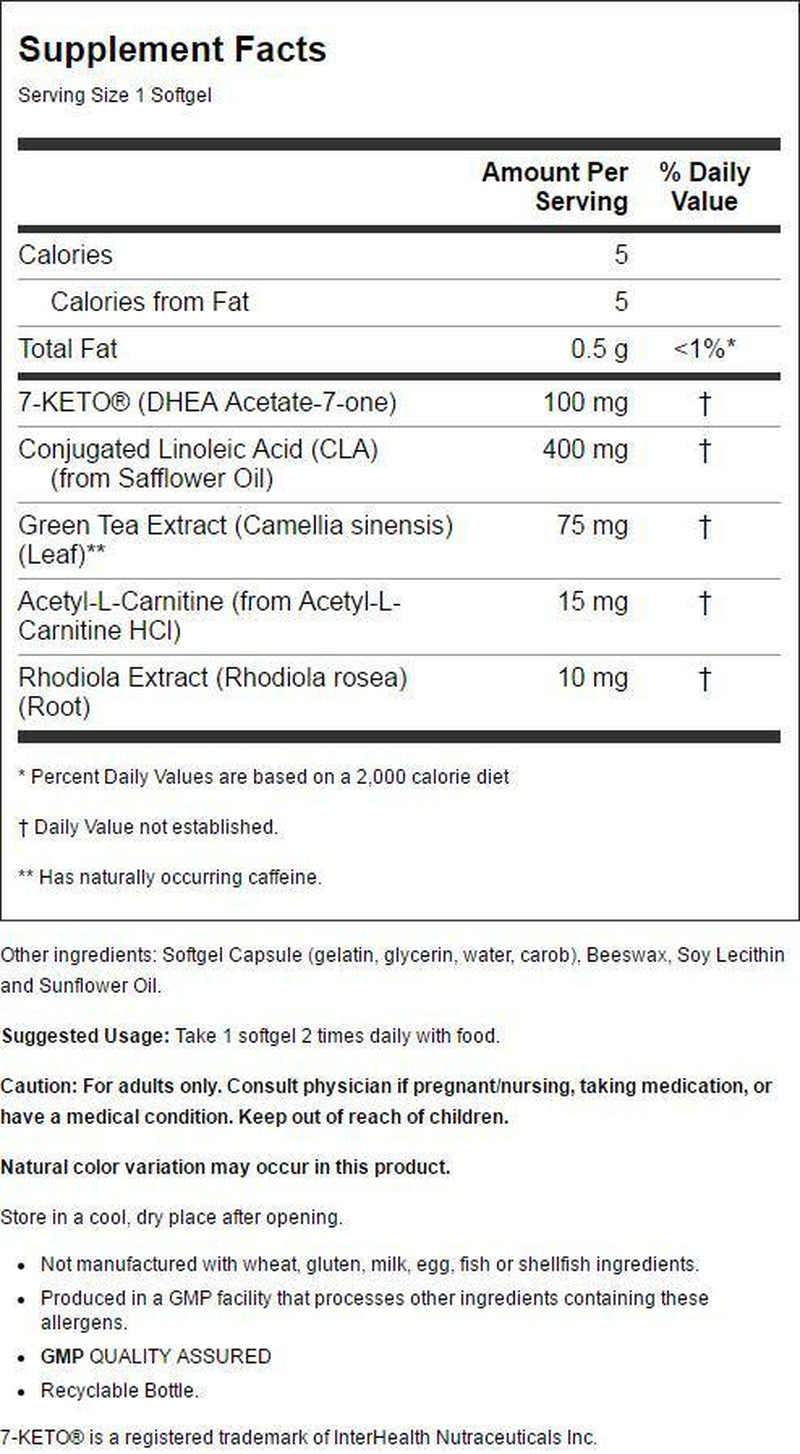 - WITH CLA AND MORE: NOW® 7-KETO® LeanGels™ also includes CLA, Green Tea Extract, Acetyl-L-Carnitine, and Rhodiola extract as complements to 7-KETO®.