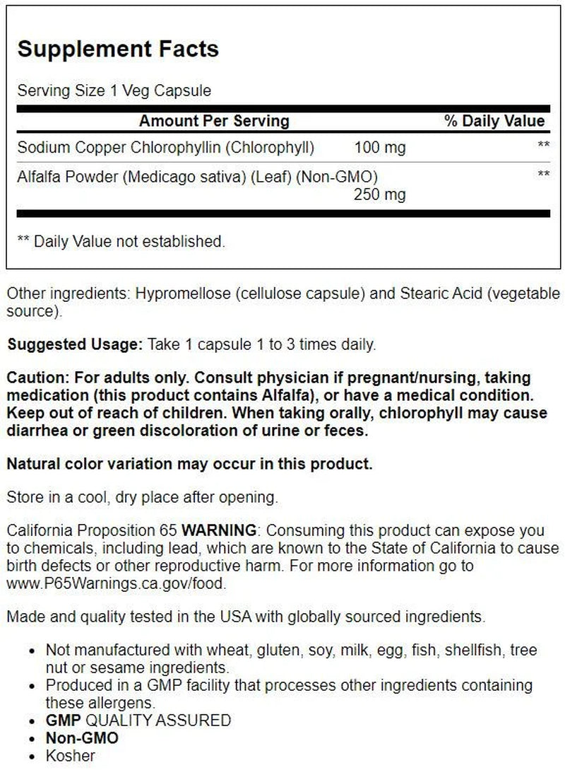- WITH ALFALFA POWDER: Chlorophyll is critical for photosynthesis, the process by which sunlight is converted into chemical energy. Chlorophyll can function as a free radical neutralizer, may help to support the body's detoxification processes and has been traditionally used as an internal deodorizer.*
