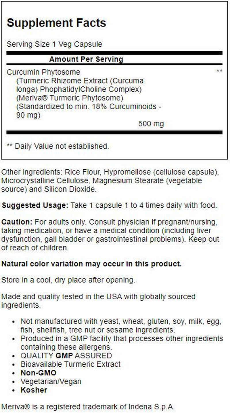 Curcumin, the active polyphenolic extract of turmeric, is one of the most scientifically investigated plant compounds.* However, curcumin's health-supporting properties depend on its bioavailability.* Curcumin phytosome is a unique form of curcumin complexed with phosphatidylcholine that clinically demonstrates enhanced absorption and bioavailability as compared with standard curcumin extracts.* Clinical studies also show that curcumin phytosome is a powerful free radical scavenger, can help to support a balanced immune system response to normal metabolic stress, and can promote healthy joint mobility and flexibility.* Natural color variation may occur in this product.