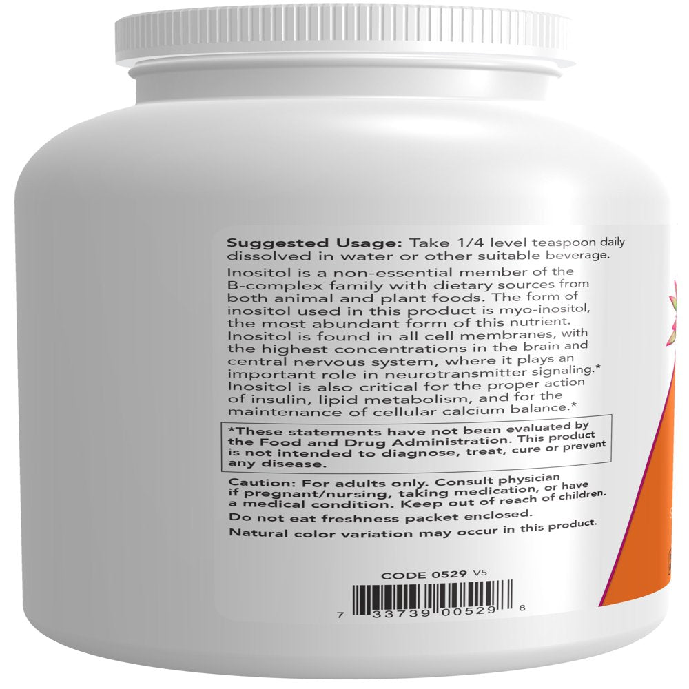 Inositol is a non-essential member of the B-Complex family with dietary sources from both animal and plant foods. The form of Inositol used in this product is Myo-Inositol, the most abundant form of this nutrient. Inositol is found in all cell membranes, with the highest concentrations in the brain and central nervous system, where it plays an important role in neurotransmitter signaling.* Inositol is also critical for the proper action of insulin, lipid metabolism, and for the maintenance of cellular calcium balance.* As a family-owned company since 1968 — NOW produces high-quality natural products at prices everyone loves. We are a respected leader in the natural products industry, with a mission to provide value in products and services that empower people to lead healthier lives.