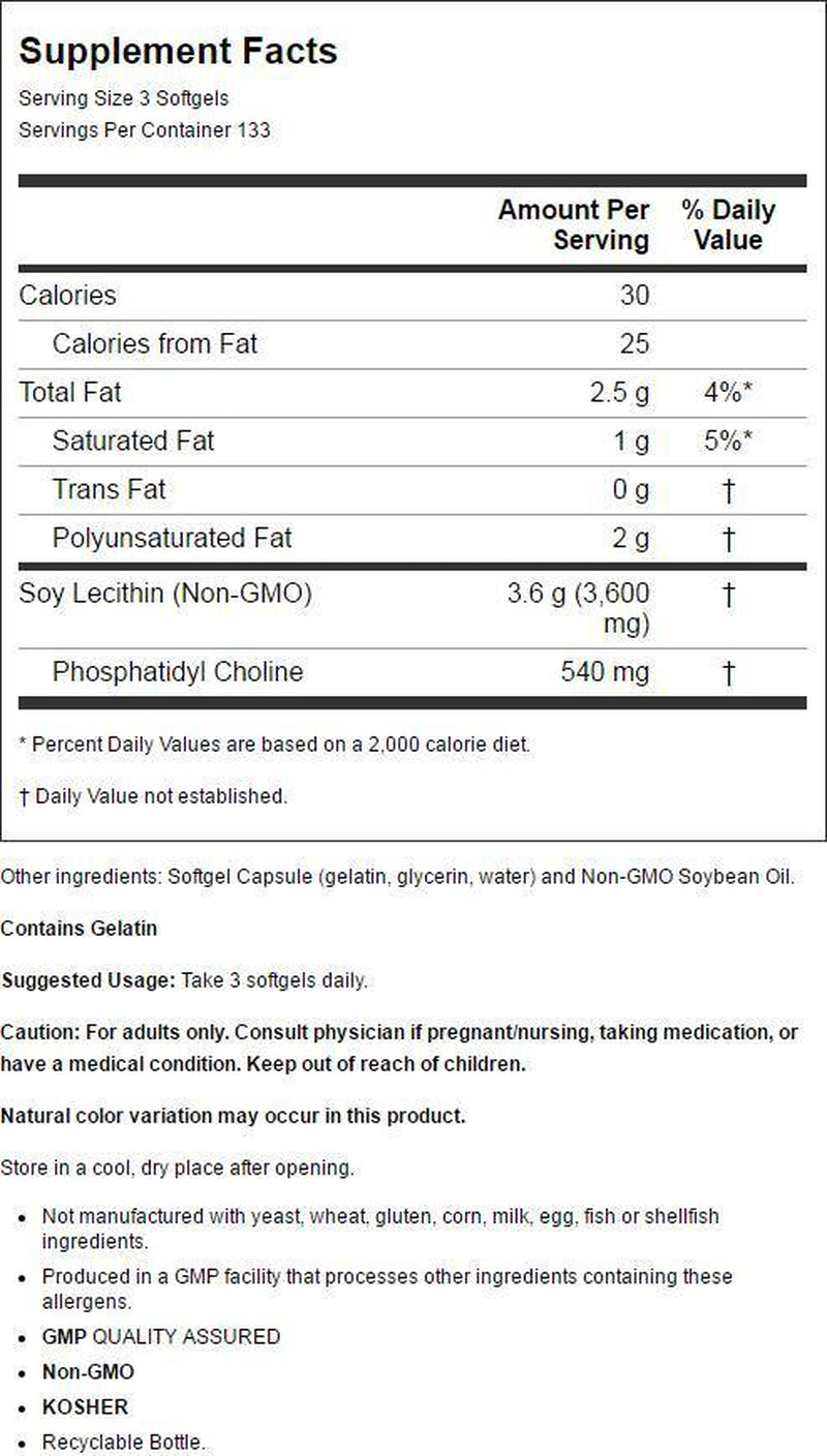 NOW® Non-GMO Lecithin Softgels have Phosphatidyl Choline, which comprises a major portion of our brain and nervous system. Lecithin also has naturally occurring essential fatty acids and Inositol. Lecithin aids in emulsifying fats, enabling them to be dispersed in water.*