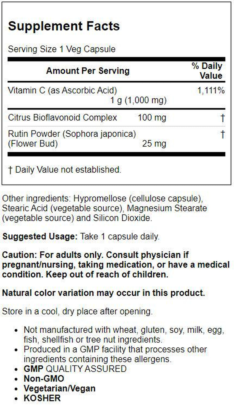 Vitamin C is a water soluble nutrient well known for its vital role in the immune system.* Vitamin C is needed for amino acid metabolism, neurotransmitter synthesis, and the utilization of many nutrients, such as folic acid and iron.* It is also a highly effective antioxidant that can help maintain healthy tissues by neutralizing free radicals generated during normal metabolism and exposure to environmental stressors.* This product includes Bioflavonoids, which work synergistically to support Vitamin C utilization.* Natural color variation may occur in this product.