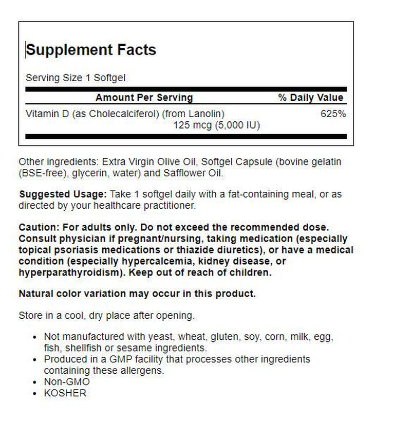 NOW® Supplements Vitamin D-3 5000 IU softgels supply this key vitamin in a highly-absorbable liquid softgel form. Vitamin D is normally obtained from the diet or produced by the skin from the ultraviolet energy of the sun. However, it is not abundant in food. As more people avoid sun exposure, vitamin D supplementation becomes even more necessary to ensure that your body receives an adequate supply. Natural color variation may occur in this product.