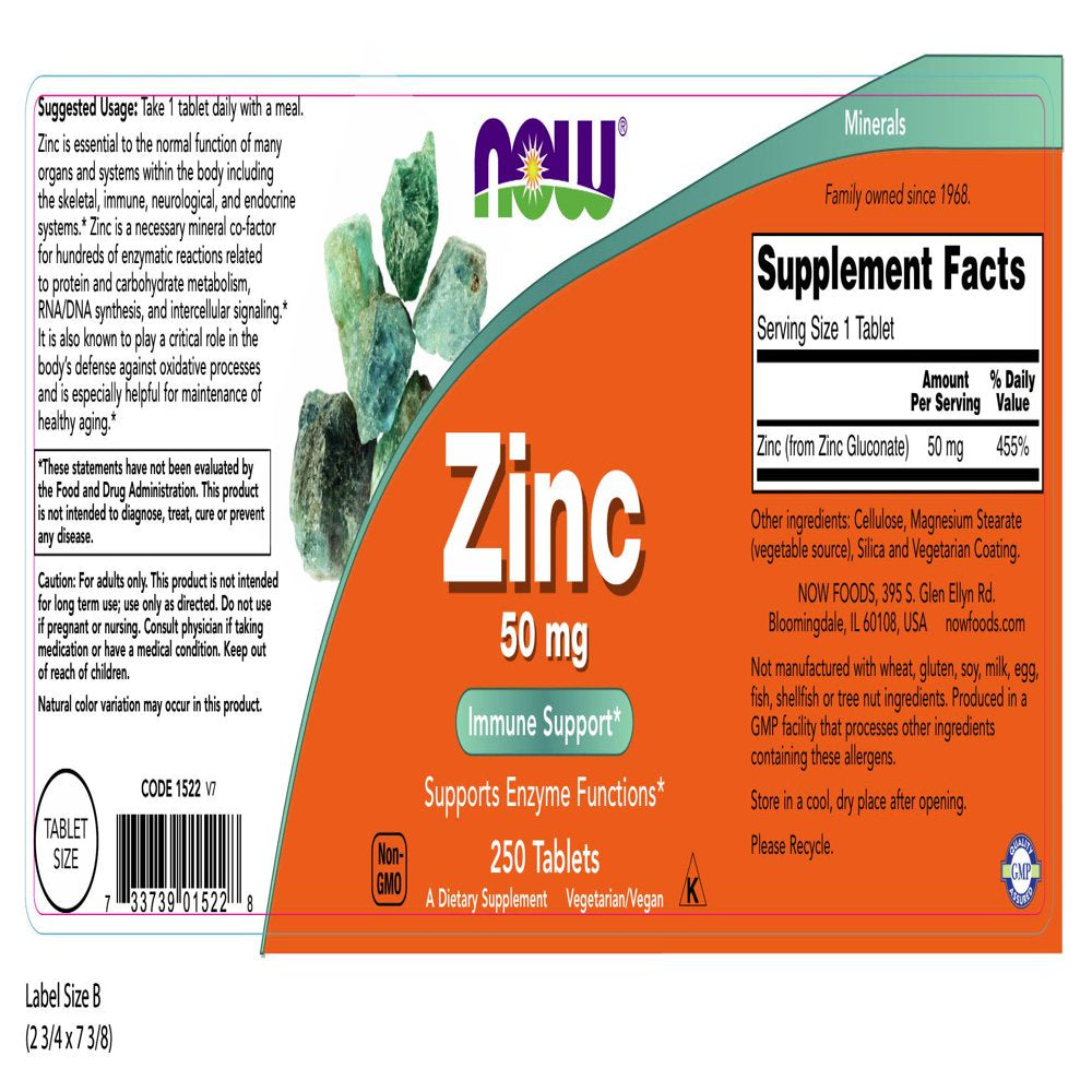 NOW Supplements, Zinc (Zinc Gluconate) 50 Mg, Supports Enzyme Functions*, Immune Support*, 250 Tablets - 2 Pack