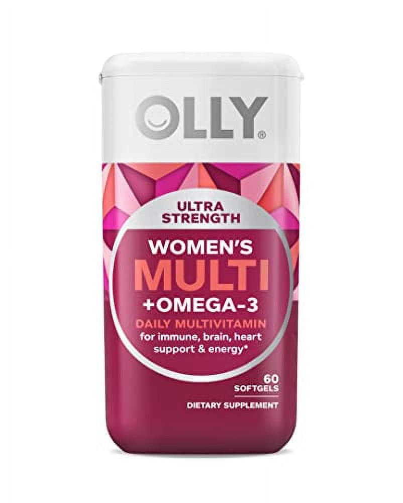 OLLY ULTRA WOMEN’S MULTI + OMEGA-3 SOFTGELS: This nutrient-packed powerhouse serves up the essentials you need to thrive on the daily, like support for your brain, heart, immune system and hair, skin and nails-just to name a few* | THE GOODS INSIDE: B12 is essential for the production of cellular energy. Omega-3s provide support for your brain, nervous system and eye function, and antioxidant nutrients help protect against free radical damage* | HOW TO TAKE: Take 2 softgels with food daily. Swallow whole with water, do not chew. Comes with 60 capsules per bottle for a 30 day supply | ULTRA SOFTGELS: Our premium Softgel blends are naturally colored, easy to swallow and have a hint of mint and lemon scent with zero sugar. These daily women's multi vitamin also comes in a convenient compact package | MIX AND MATCH: Delightful OLLY products can be taken together-mix and match as you please